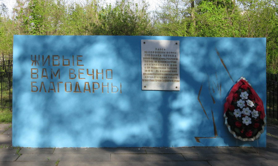 Братская могила № 11 (61-1291) – на могиле установлена прямоугольная плита размером 6,0 х 1,8 м с надписью «Живые Вам вечно благодарны» Посередине мемориальная плита с надписью: «Здесь похоронены воины 230 полка КВНКВД за г. Ростов-на-Дону 21.ХI.1941г. на зеленом острове в пятичасовом бою с 12-ю фашистскими танками 26-29.ХI.41г. в уличных боях при захвате и удержании плацдарма в Пролетарском районе. Вечная слава героям Зеленого острова».